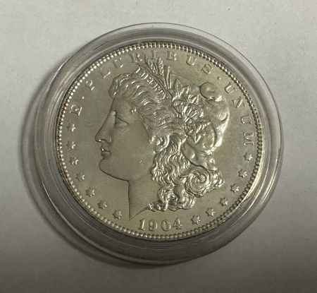 1904-0 Morgan Silver Dollar, fine, in case. Location Back Tall Cases 1904-0 Morgan Silver Dollar, fine, in case. Location Back Tall Cases