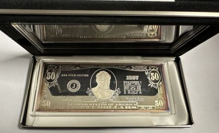 1997 1/4 LB .999 Proof Silver Fifty Dollar Bill, Washington Mint Item. Location Back Tall Cases 1997 1/4 LB .999 Proof Silver Fifty Dollar Bill, Washington Mint Item. Location Back Tall Cases