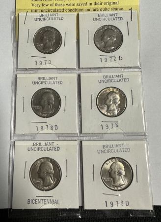 Brilliant Uncirculated Washington Quarters, 1970, 1972D, 1978D, 1978, 1976, 1979D, in cases. Location Back Tall Cases Brilliant Uncirculated Washington Quarters, 1970, 1972D, 1978D, 1978, 1976, 1979D, in cases. Location Back Tall Cases
