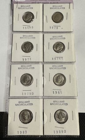8 Brilliant Uncirculated Roosevelt Dimes, 1969D, 1970, 1972, 1974D, 1979D, 1981, 1989, and 1989D, paper case, Location Back Tall Cases 8 Brilliant Uncirculated Roosevelt Dimes, 1969D, 1970, 1972, 1974D, 1979D, 1981, 1989, and 1989D, paper case, Location Back Tall Cases