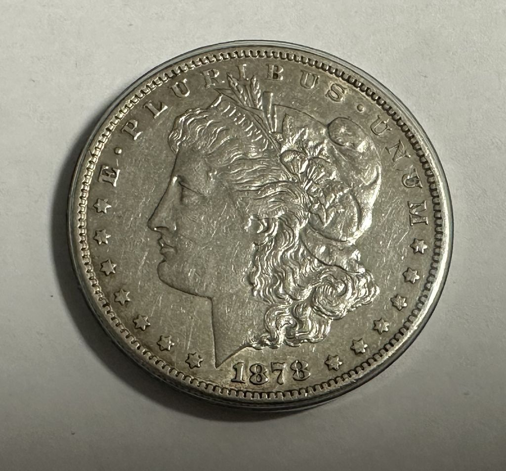 1878-S Morgan Silver Dollar, fine, plastic case. Location Back Tall Cases 1878-S Morgan Silver Dollar, fine, plastic case. Location Back Tall Cases