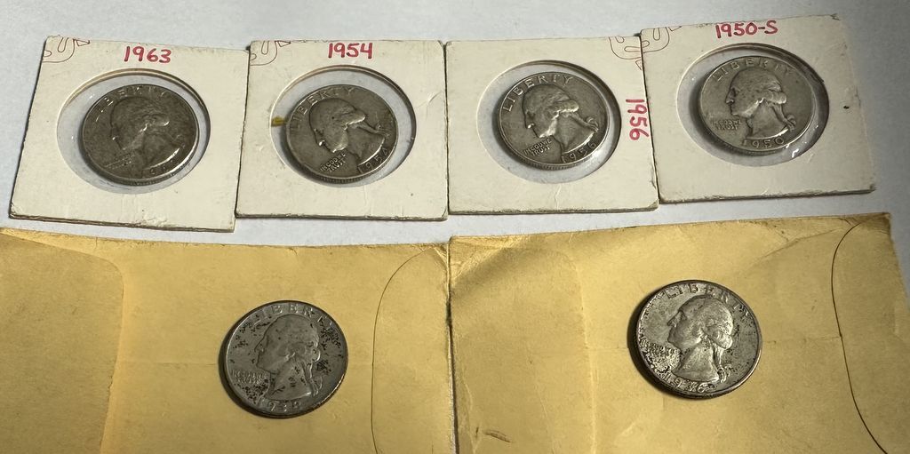 6 Washington Quarter, 1936S XF, 1938 VF, 1963, 1954, 1956, 1950-S. Location Back Tall Case 6 Washington Quarter, 1936S XF, 1938 VF, 1963, 1954, 1956, 1950-S. Location Back Tall Case