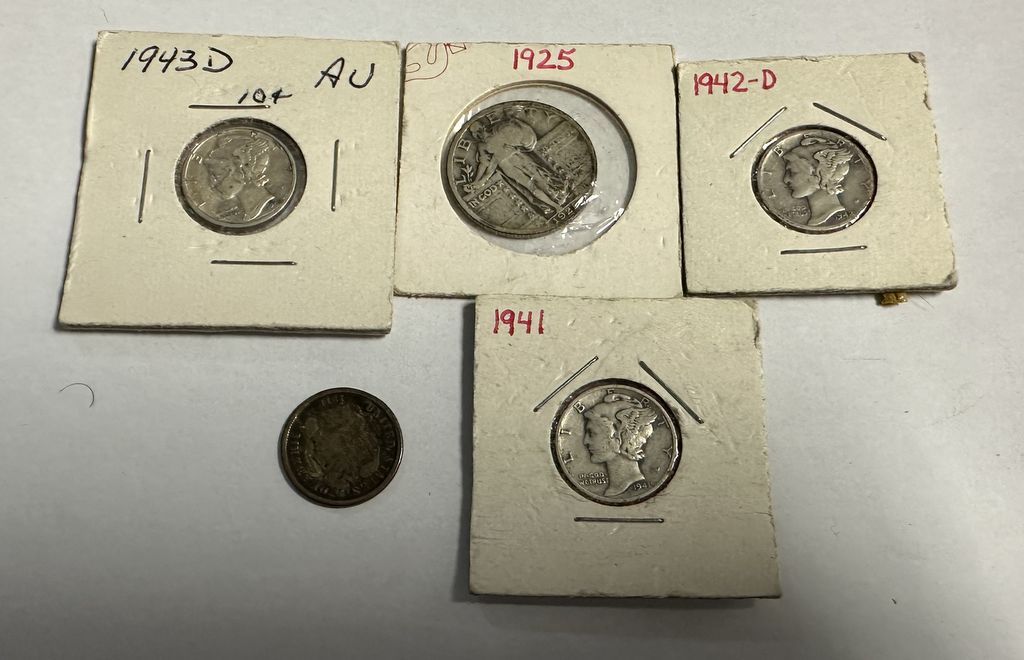 1941, 1942-d, 1943-D Au Mercury Dimes, 1925 Standing Liberty Quarter Dollar, 1911 Barber dime. Location Back Tall Case 1941, 1942-d, 1943-D Au Mercury Dimes, 1925 Standing Liberty Quarter Dollar, 1911 Barber dime. Location Back Tall Case