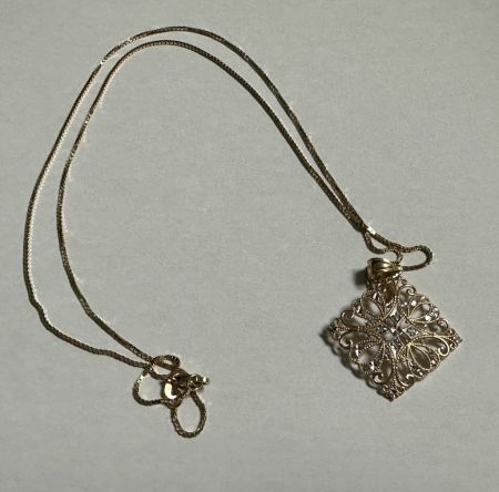 14K Pendent Necklace, 14K chain., 4.0 grams, Location Back Tall Case 14K Pendent Necklace, 14K chain., 4.0 grams, Location Back Tall Case