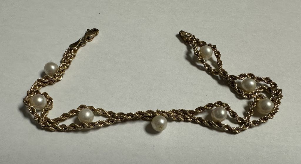 10K Rope Bracelet with Pearls. 4.6 grams, Location Back Tall Case 10K Rope Bracelet with Pearls. 4.6 grams, Location Back Tall Case