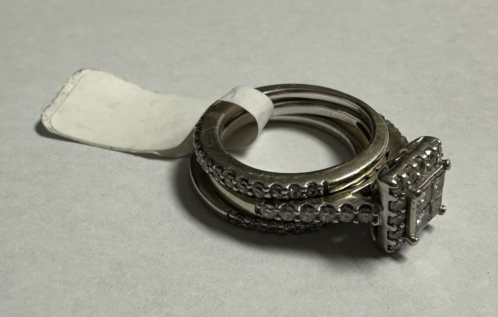 IKS Sterling Wedding Band Set, with diamonds, size 5 1/2, 8.4 grams, Location Back Tall Case IKS Sterling Wedding Band Set, with diamonds, size 5 1/2, 8.4 grams, Location Back Tall Case