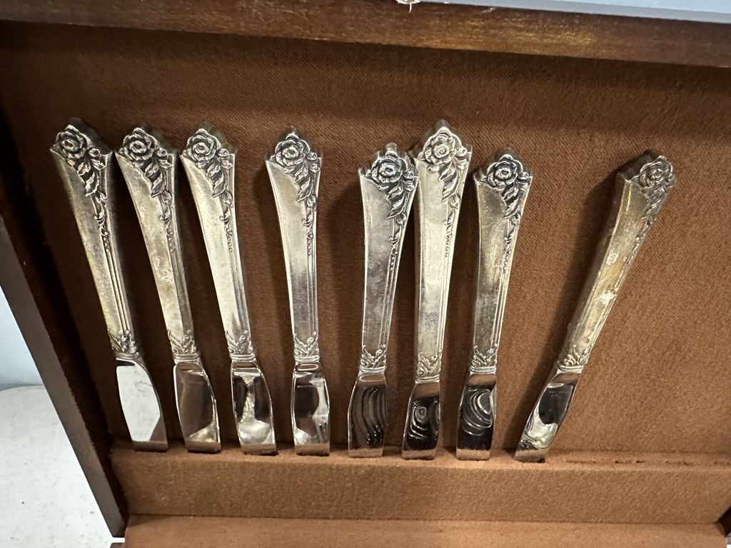 4 butter, 7 ice tea spoons, 8 salad spoons, 11 spoons, 7 forks, 4 serving spoons, serving knife, 8 knives, 53.40 ozt, Location Case behind Screen 4 butter, 7 ice tea spoons, 8 salad spoons, 11 spoons, 7 forks, 4 serving spoons, serving knife, 8 knives, 53.40 ozt, Location Case behind Screen