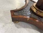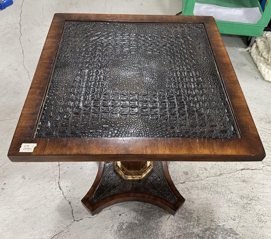John Richard "Campaign" Pedestal Table, acacia wood, walnut finish with gold highlights, mold resin alligator top, some loose veneer on base, 30"h., 25"w. Retail 1500.00, Location Row 1 John Richard "Campaign" Pedestal Table, acacia wood, walnut finish with gold highlights, mold resin alligator top, some loose veneer on base, 30"h., 25"w. Retail 1500.00, Location Row 1
