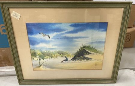 Joanne Dwyer Watercolor of Lady on Beach, matted, framed, 16"h., 20"w, Location Right Wall Joanne Dwyer Watercolor of Lady on Beach, matted, framed, 16"h., 20"w, Location Right Wall
