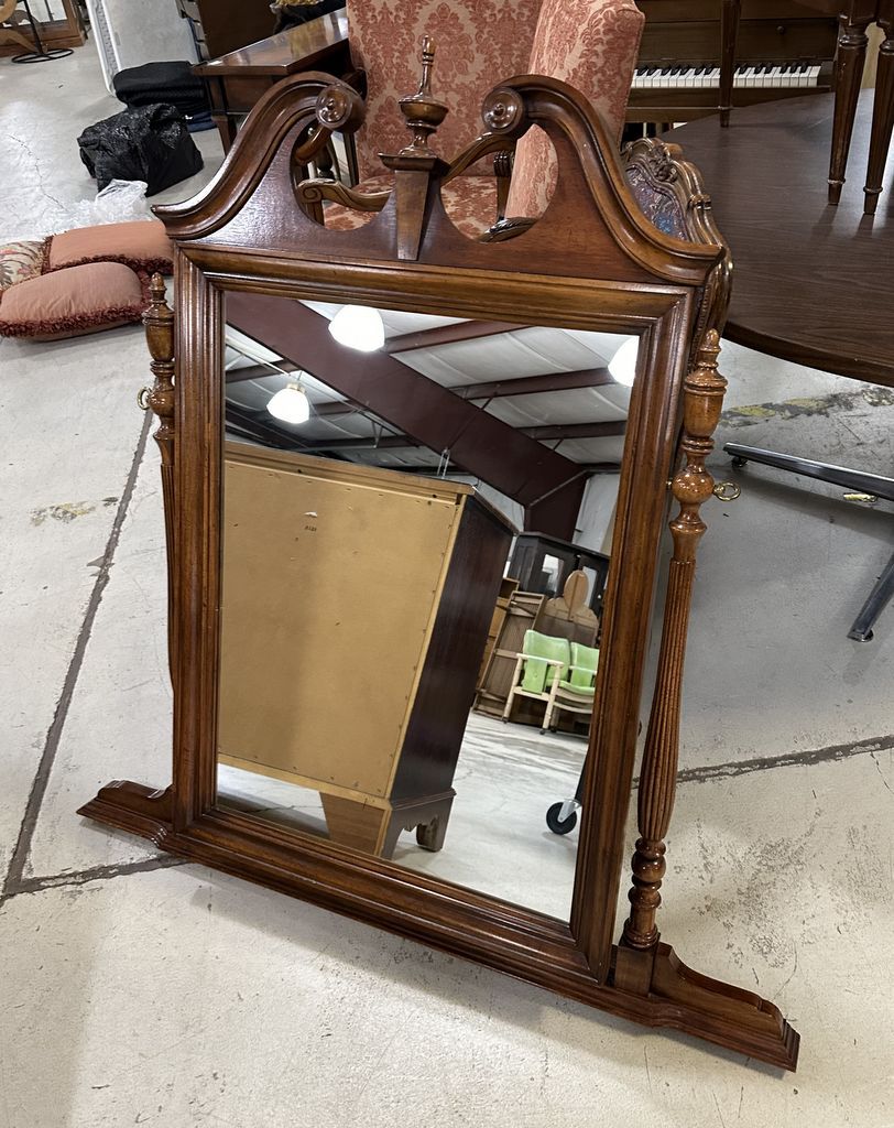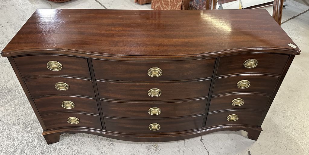 Dixie Co. Mahogany Triple Dresser, Duncan Phyfe Style, good condition, has back mirror, 32"h., 59"w. Location Row 9 Dixie Co. Mahogany Triple Dresser, Duncan Phyfe Style, good condition, has back mirror, 32"h., 59"w. Location Row 9