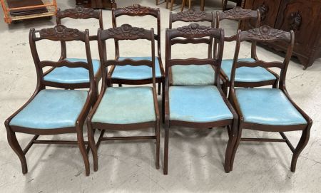 8 Duncan Phyfe Mahogany Dining Chairs, carved Rose back, has some finish stain wear, Location Row 12 8 Duncan Phyfe Mahogany Dining Chairs, carved Rose back, has some finish stain wear, Location Row 12