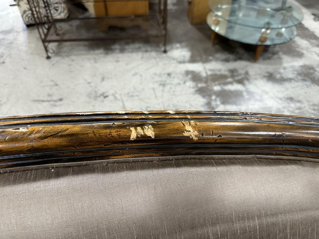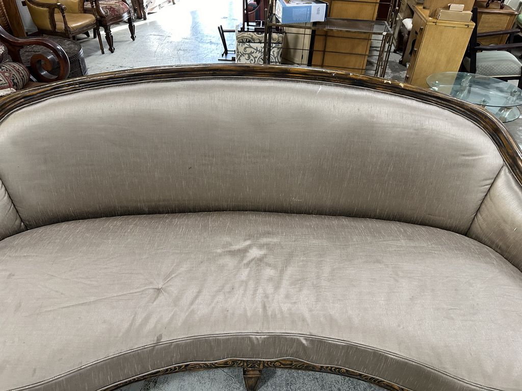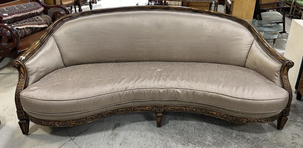 Large Reproduction French Style Designer Sofa, single cushion, under cloth is loose, some frame wear, 8' long. Location Center Large Reproduction French Style Designer Sofa, single cushion, under cloth is loose, some frame wear, 8' long. Location Center
