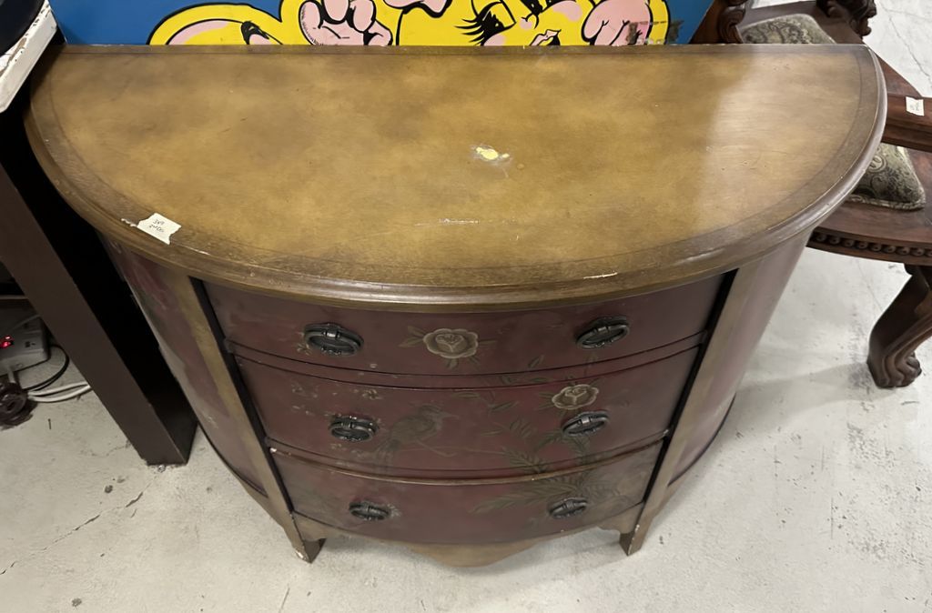 Antique Reproduction Designer Demilune Commode, three drawers, has some chips in finish, 34"h., 42"w. Location Front Antique Reproduction Designer Demilune Commode, three drawers, has some chips in finish, 34"h., 42"w. Location Front