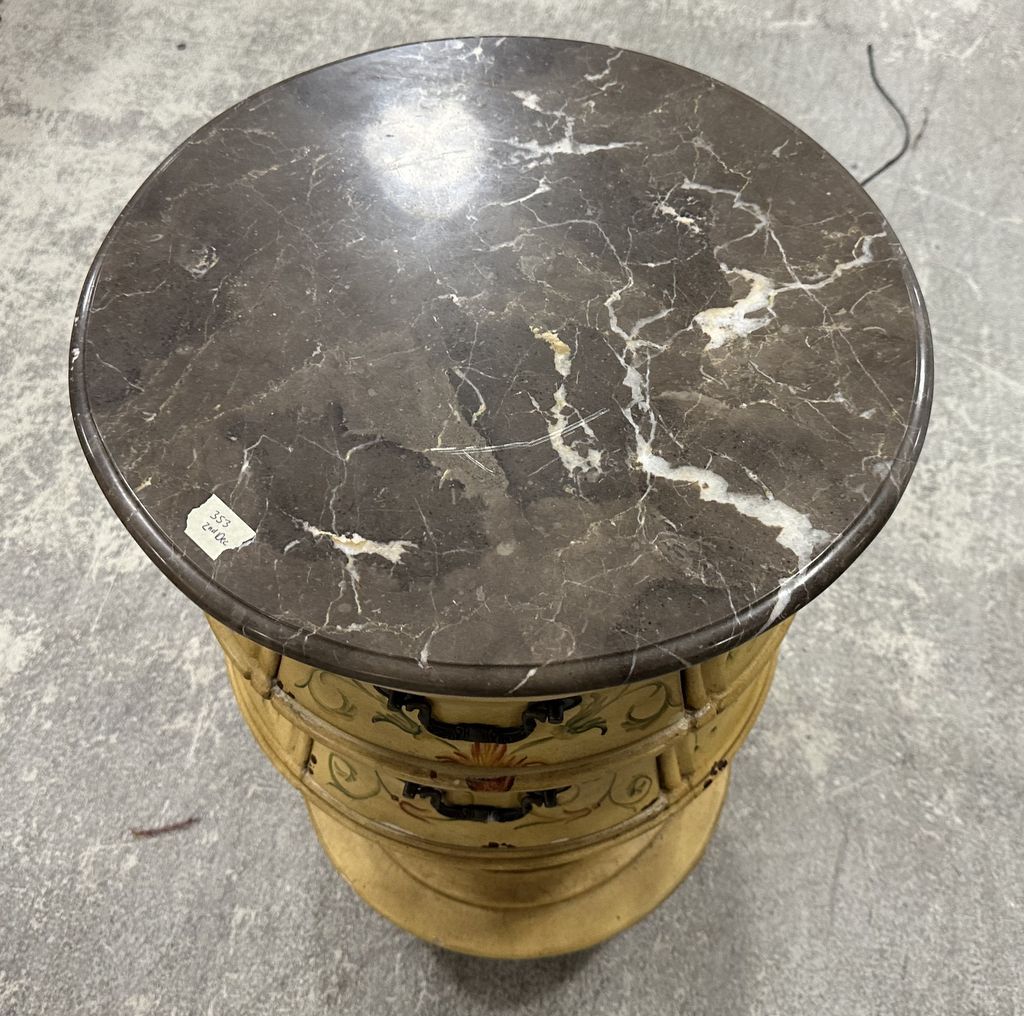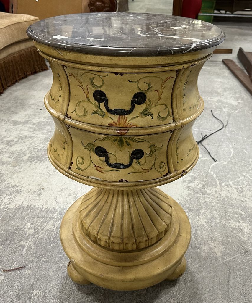 Ultimate Accents Factory Pedestal Table, factory painted, marble round top, two drawers, middle section alittle loose, 33"h., 20"dia. Location Front Ultimate Accents Factory Pedestal Table, factory painted, marble round top, two drawers, middle section alittle loose, 33"h., 20"dia. Location Front