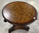 Haverty's Mahogany Round Lamp Table, burl, metal pedestal base, 28"h., 28"dia. Haverty's Mahogany Round Lamp Table, burl, metal pedestal base, 28"h., 28"dia.