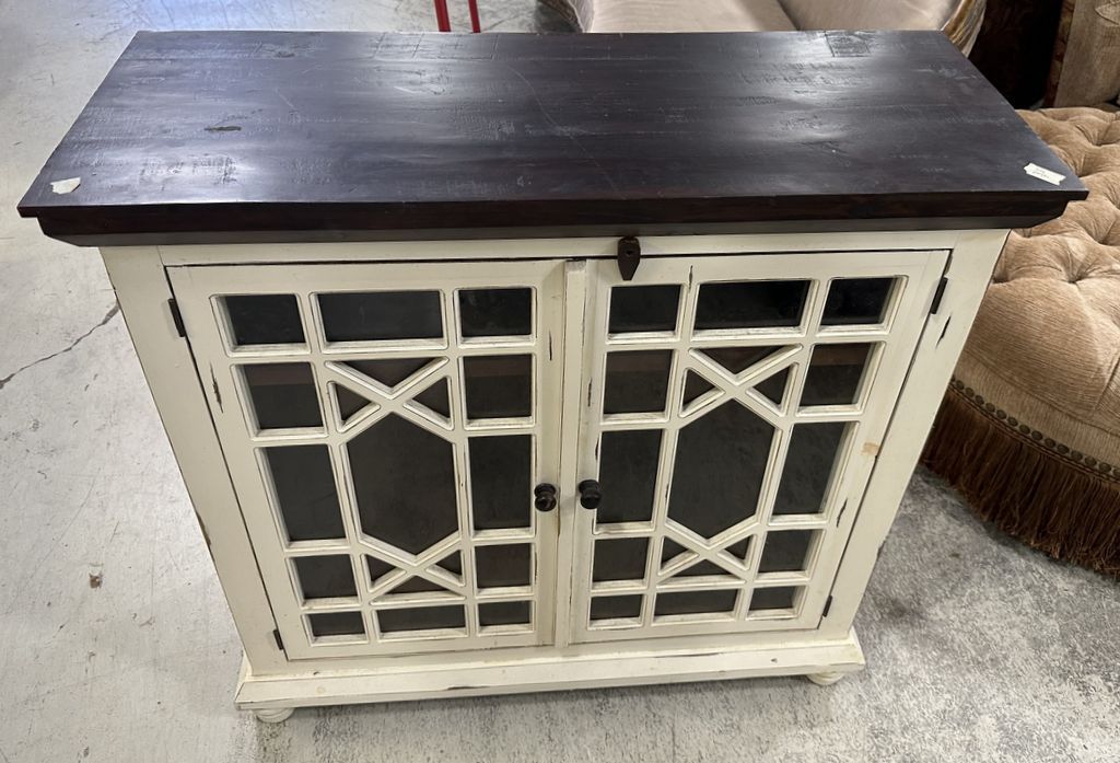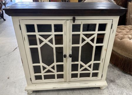 Modern Factory Painted Console Cabinet, white base, two door, black top, interior shelves, 41"h., 42"w. Location Center Modern Factory Painted Console Cabinet, white base, two door, black top, interior shelves, 41"h., 42"w. Location Center