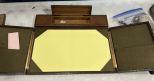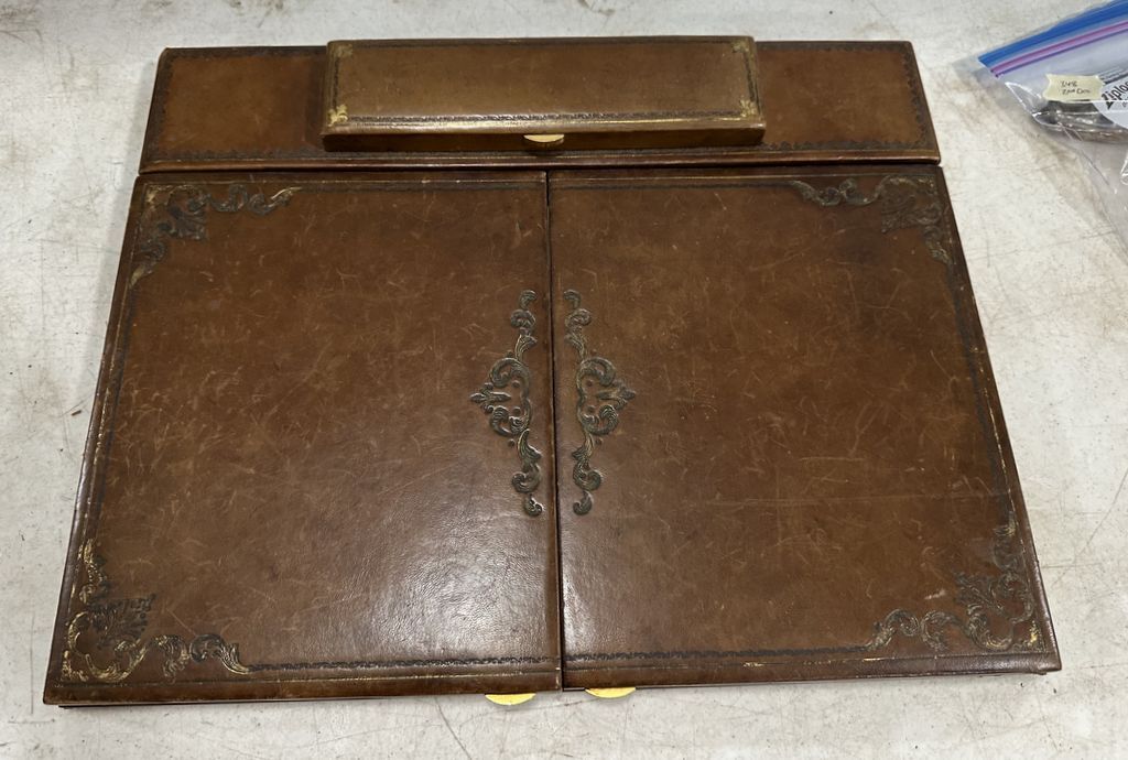 Vintage Leather Desk Set, good condition, light age wear, 16"h., 20"w. Location Front Shelves Vintage Leather Desk Set, good condition, light age wear, 16"h., 20"w. Location Front Shelves