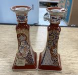 Pair of Red Ceramic Candle Holders, Chinese, 9"h, Location Back Metal Shelves Pair of Red Ceramic Candle Holders, Chinese, 9"h, Location Back Metal Shelves