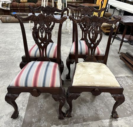 Four Antique Reproduction Chippendale Dining Chairs, ball-n-claw, has foot wear. Four Antique Reproduction Chippendale Dining Chairs, ball-n-claw, has foot wear.