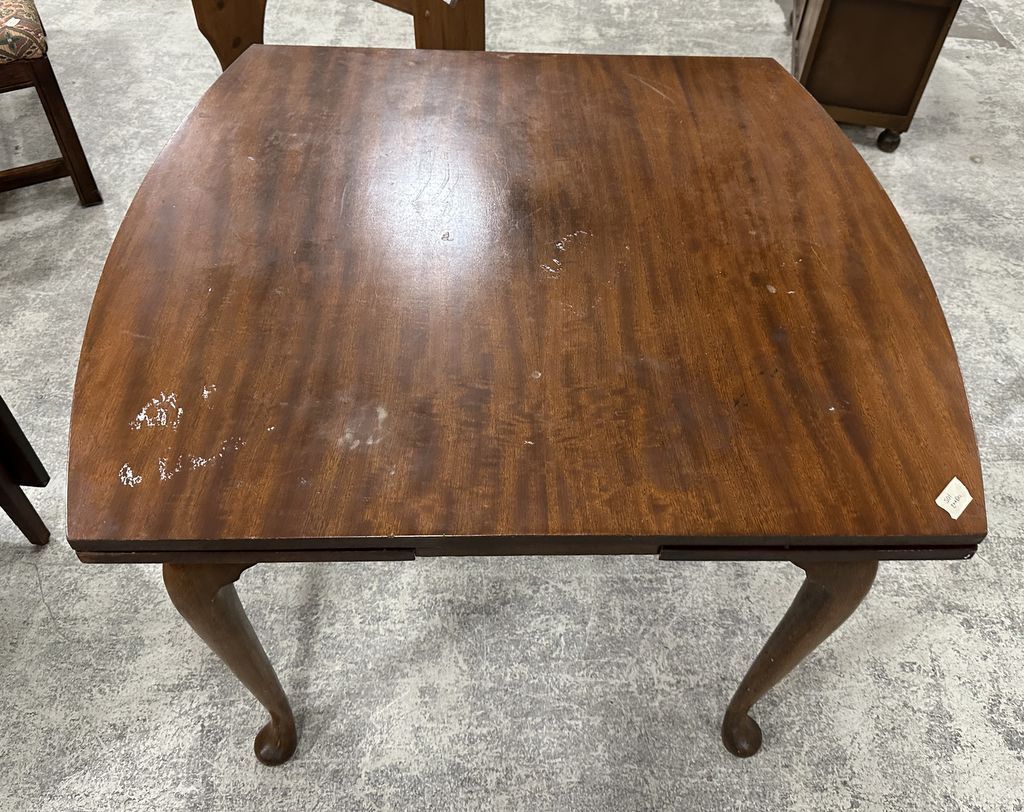 Mahogany Queen Anne Pub Table, pull out sides, has scratches and wear, 29"h., 39"w. Location Back Center Mahogany Queen Anne Pub Table, pull out sides, has scratches and wear, 29"h., 39"w. Location Back Center