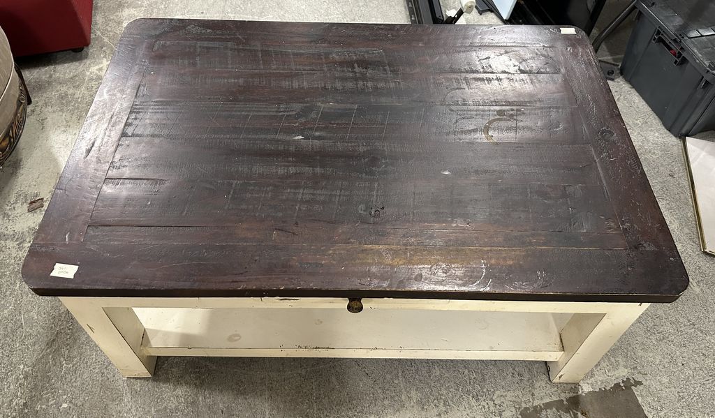 Factory White Painted Coffee Table, wood top, single drawer, 20"h., 46"w. Location Center Factory White Painted Coffee Table, wood top, single drawer, 20"h., 46"w. Location Center