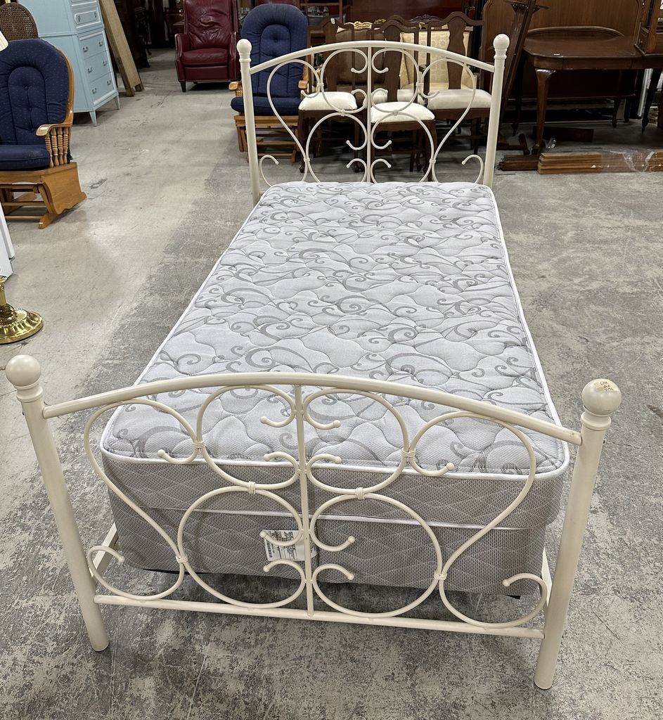 White Metal Twin Bed with new Serta Mattress. Location Back Center White Metal Twin Bed with new Serta Mattress. Location Back Center