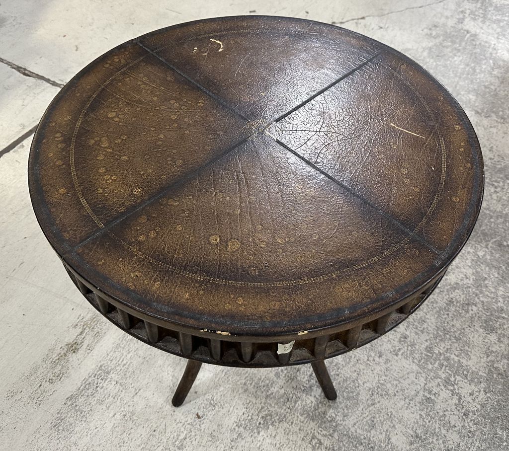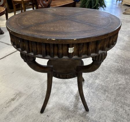 Modern Reproduction Cherry Round Pedestal Lamp Table, faux leather top, ring marks, 28"h., 28"dia. Location Row 3 Modern Reproduction Cherry Round Pedestal Lamp Table, faux leather top, ring marks, 28"h., 28"dia. Location Row 3