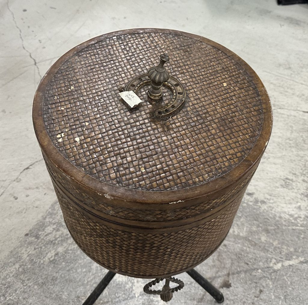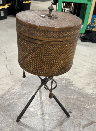 Decorative Faux Woven Liquor Box, on stand, 34"h., 16"dia. Location Row 2 Decorative Faux Woven Liquor Box, on stand, 34"h., 16"dia. Location Row 2