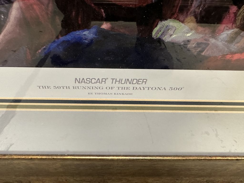 Nascar Thunder Print by Thomas Kinkade, 50th Running of the Daytona 500, matted, framed, 34"h., 42"w, Location Front Shelves Nascar Thunder Print by Thomas Kinkade, 50th Running of the Daytona 500, matted, framed, 34"h., 42"w, Location Front Shelves