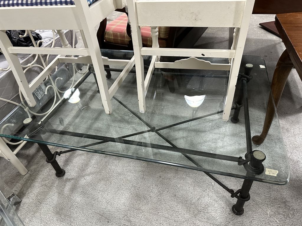 Contemporary Glass Top Coffee Table, 17"h., 48"w. Location Back Center Contemporary Glass Top Coffee Table, 17"h., 48"w. Location Back Center