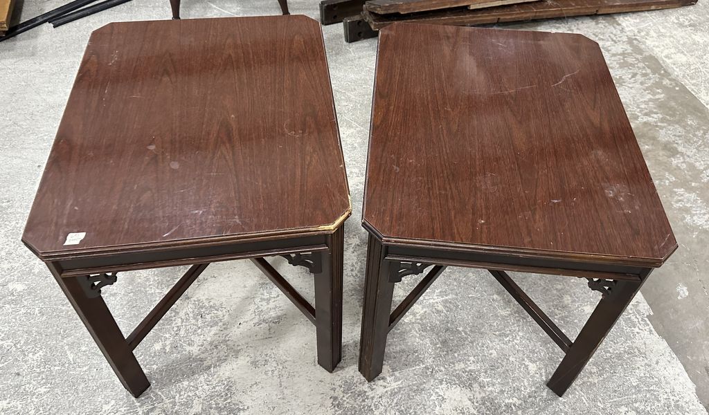 Pair of Chinese Chippendale Style Cherry Lamp Tables, worn spots, 24"h., 22"w. Location Row 5 Pair of Chinese Chippendale Style Cherry Lamp Tables, worn spots, 24"h., 22"w. Location Row 5