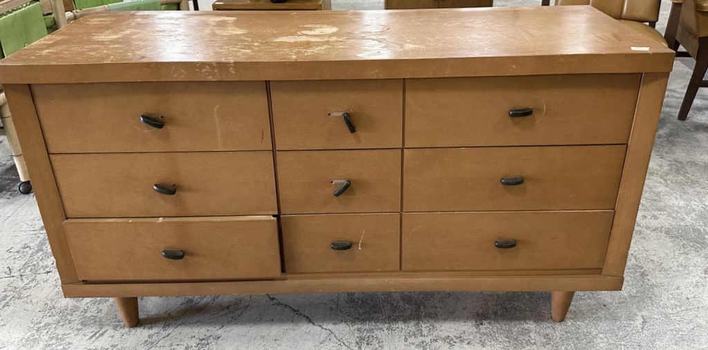 Mid Century Triple Dresser, top worn, 32"h., 52"w. Location Row 12 Mid Century Triple Dresser, top worn, 32"h., 52"w. Location Row 12