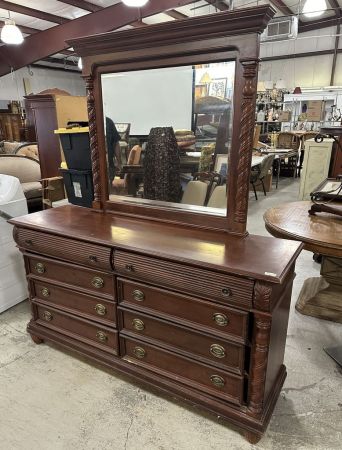 Late 20th Century Cherry Traditional Dresser, finish is worn, back leg needs repair, has mirror, 36"h., 68"w. Location Center Late 20th Century Cherry Traditional Dresser, finish is worn, back leg needs repair, has mirror, 36"h., 68"w. Location Center