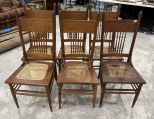 6 Pressed Oak Dining Chairs, most seats with damage, Location Row 6 6 Pressed Oak Dining Chairs, most seats with damage, Location Row 6