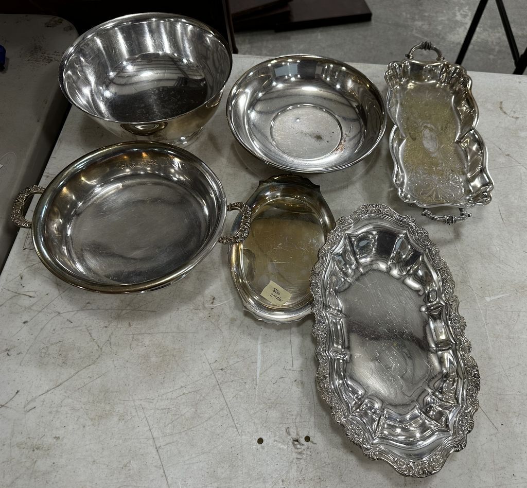 Group of Silver Plate Serving Pieces, serving bows, trays, platter, Location Back Metal Shelves Group of Silver Plate Serving Pieces, serving bows, trays, platter, Location Back Metal Shelves
