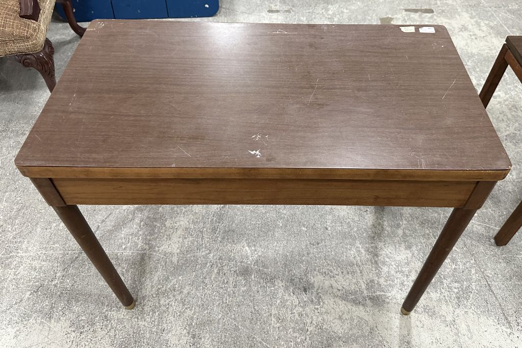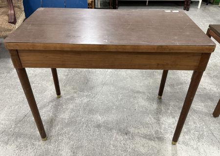 Mid Century Oak Finish Side Table, 29"h., 36"w. Location Back Center Mid Century Oak Finish Side Table, 29"h., 36"w. Location Back Center
