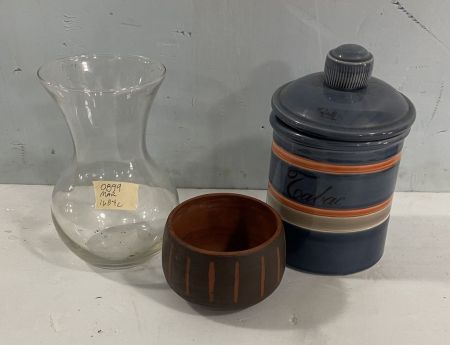 Flower Vase 7", Canister 6" and Ceramic Bowl 4" dia. Loc Glass Shelves by the Office Flower Vase 7", Canister 6" and Ceramic Bowl 4" dia. Loc Glass Shelves by the Office