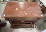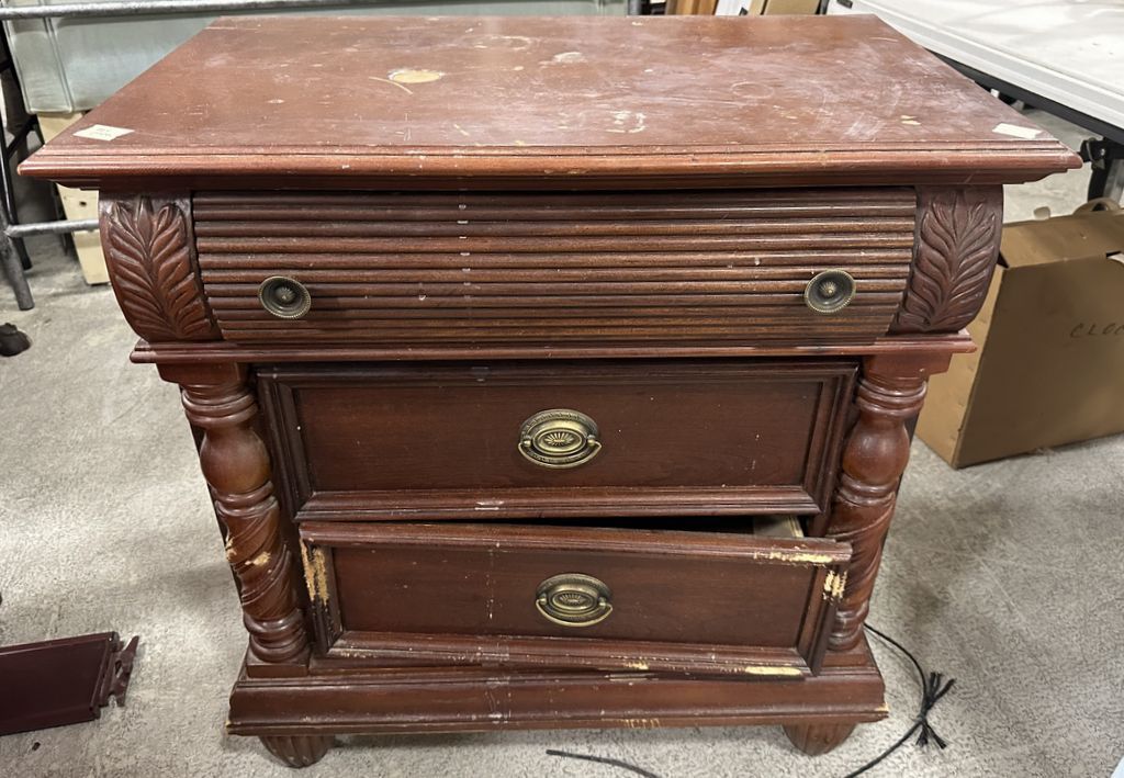 Worn Late 20th Century Cherry Nightstand, three drawers, project piece, 30"h., 30"w. Location Center Worn Late 20th Century Cherry Nightstand, three drawers, project piece, 30"h., 30"w. Location Center