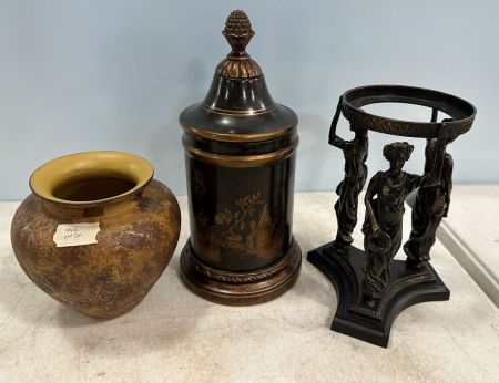 Modern Container, Figural Stand, and Glass Vase, Location Front Shelves Modern Container, Figural Stand, and Glass Vase, Location Front Shelves