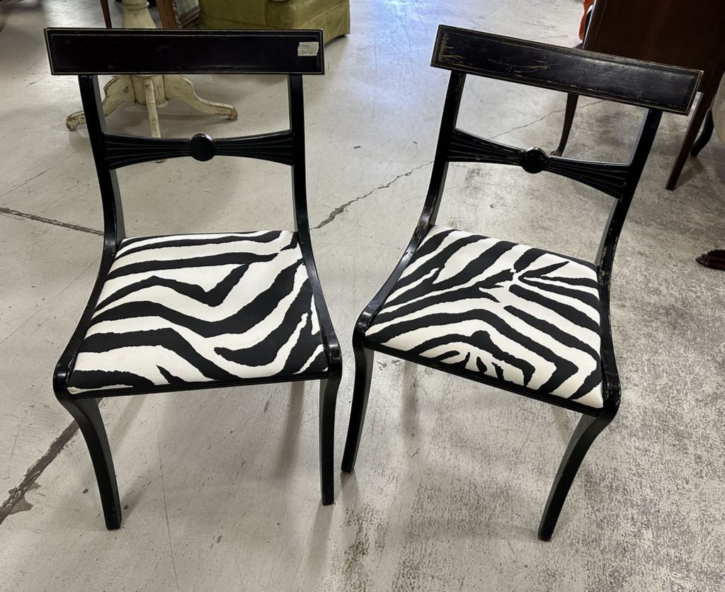 Pair of Painted Duncan Phyfe Side Chairs, zebra fabric cushions, Location Row 5 Pair of Painted Duncan Phyfe Side Chairs, zebra fabric cushions, Location Row 5