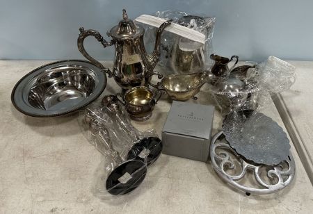 Group of Silver Plate Serving Pieces, pitchers, bowls, stands, gravy, sugar, Location Back Metal Shelves Group of Silver Plate Serving Pieces, pitchers, bowls, stands, gravy, sugar, Location Back Metal Shelves