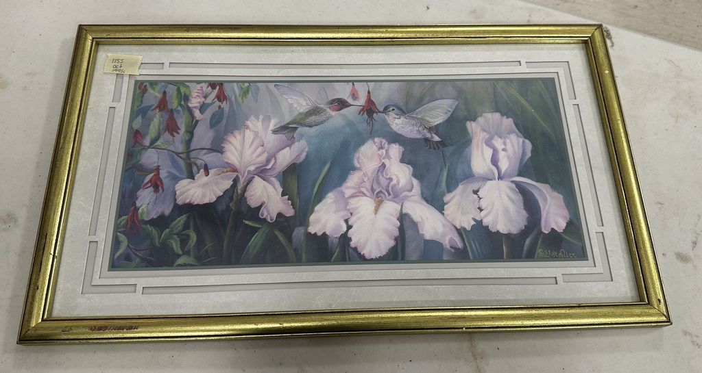 Robbin Allen Bird and Flowers, framed, 13"h., 24"w, Location Stand by Bathroom Robbin Allen Bird and Flowers, framed, 13"h., 24"w, Location Stand by Bathroom