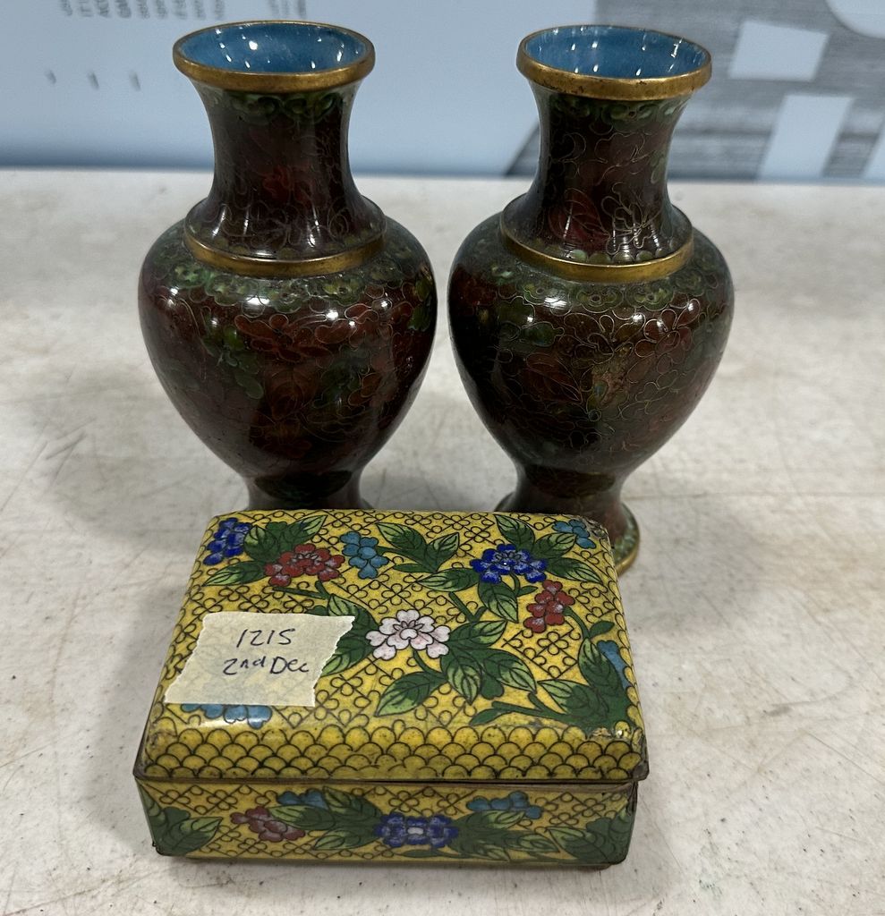 1215 Chinese Cloisonne Small Vases and Trinket Box