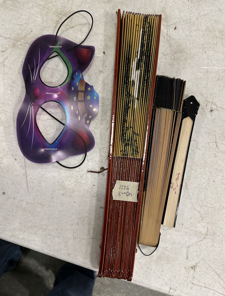 Group of Asian Geisha Fans and Cat Mask, Location Back Metal Shelves Group of Asian Geisha Fans and Cat Mask, Location Back Metal Shelves
