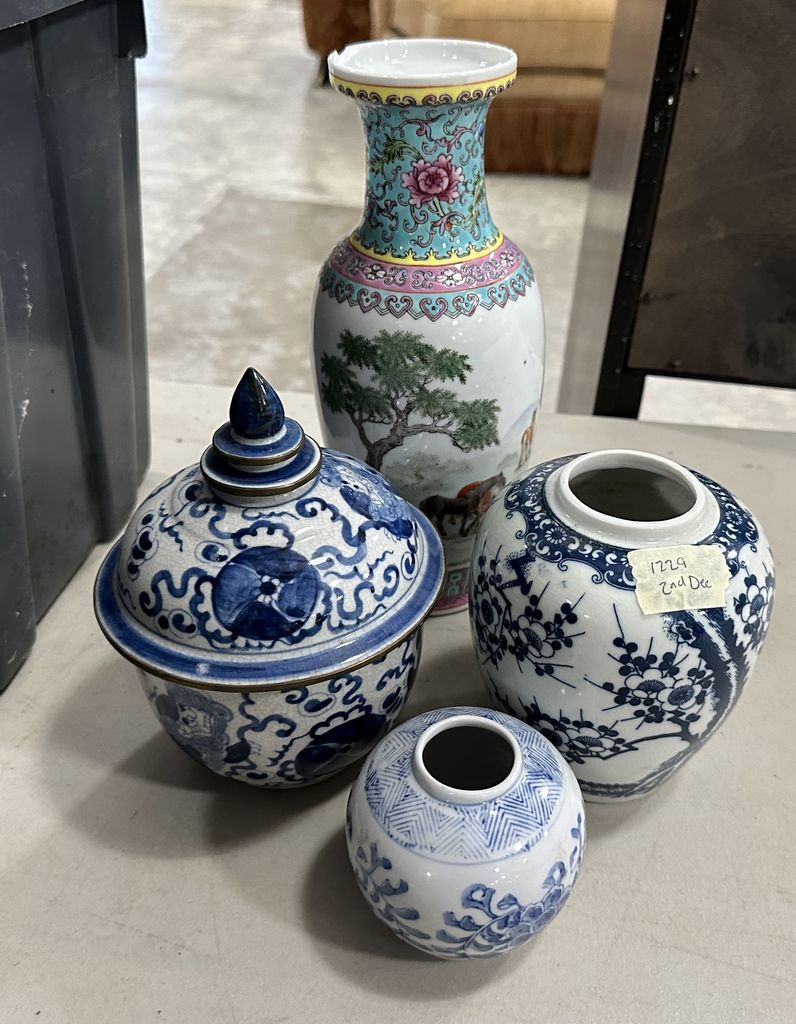 Chinese Blue and White Porcelain Vase and Vase, rim chipped, Location Back Metal Shelves Chinese Blue and White Porcelain Vase and Vase, rim chipped, Location Back Metal Shelves