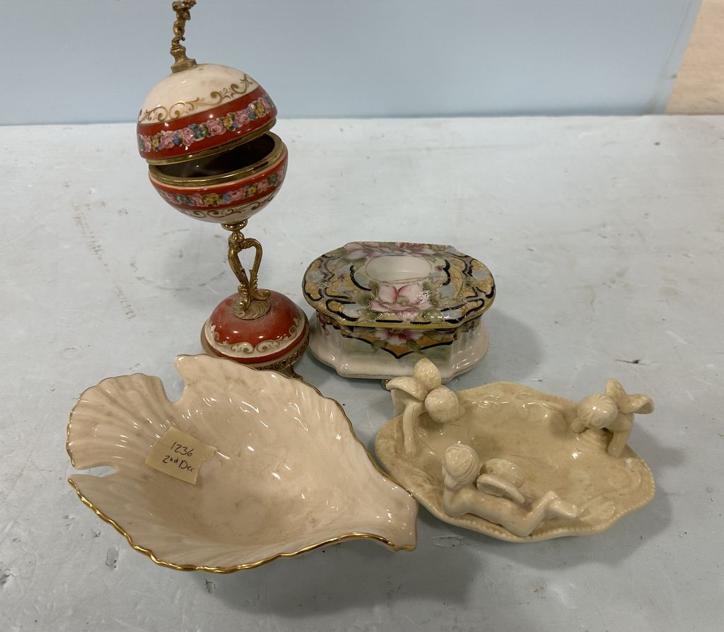 Group of Porcelain, Lenox Dove dish, bird bath, trinkets, Location Back Metal Shelves Group of Porcelain, Lenox Dove dish, bird bath, trinkets, Location Back Metal Shelves