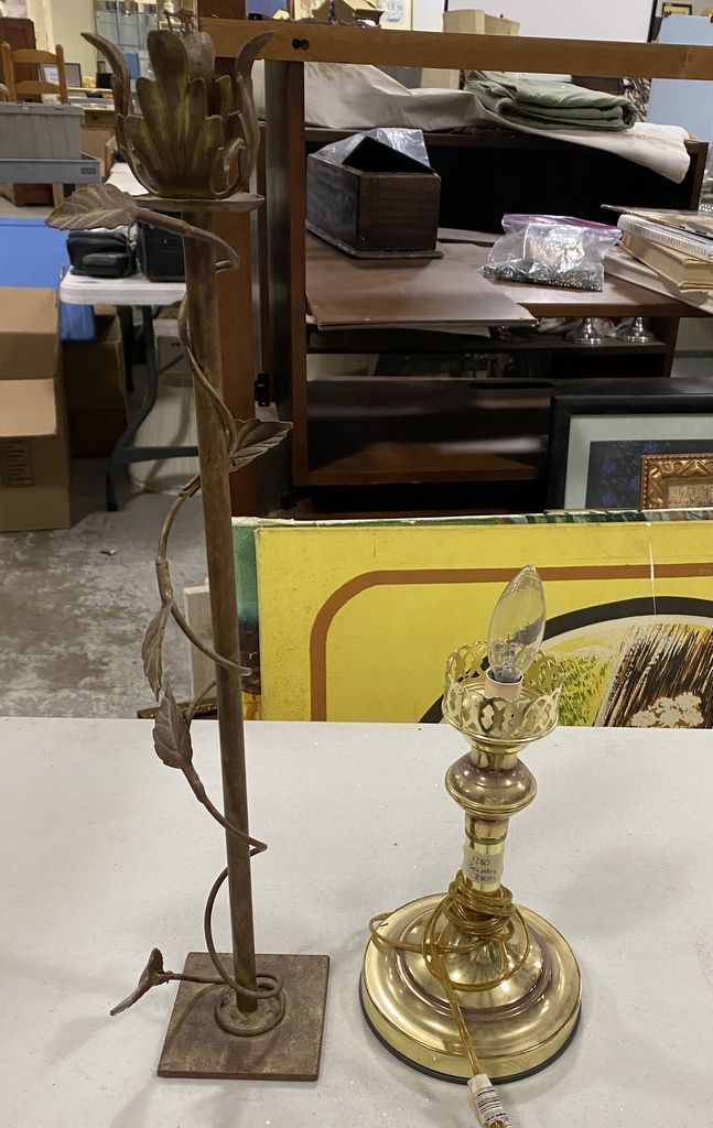 Metal Candle Holder and Brass Lamp, Location Back Metal Shelves Metal Candle Holder and Brass Lamp, Location Back Metal Shelves