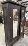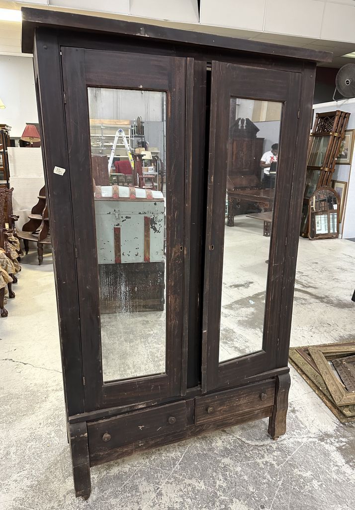 Antique Empire Style Two Door Armoire, mirrored doors, worn condition, 79"h., 45"w., 15"d. Location Row 12 Antique Empire Style Two Door Armoire, mirrored doors, worn condition, 79"h., 45"w., 15"d. Location Row 12