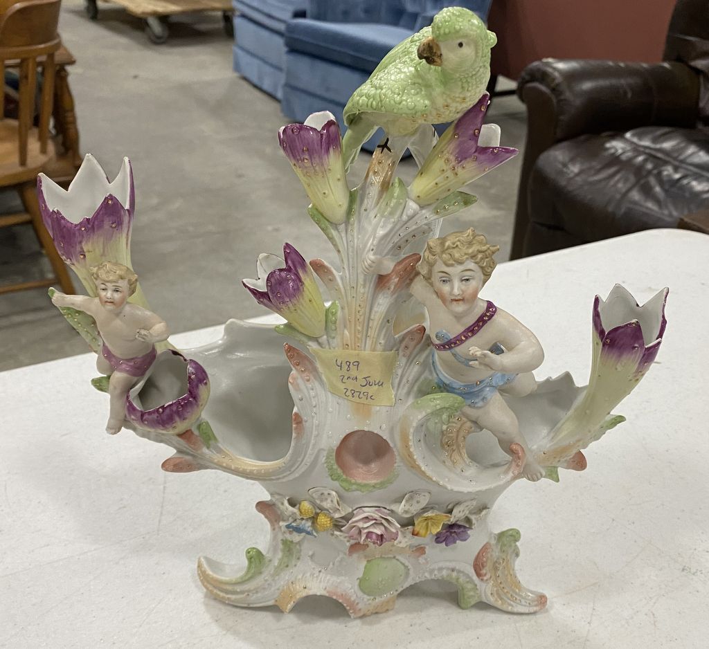 German Porcelain Figural Flower Vase, 12"h., 11"w., has some minor damage, Location Back Left Metal Shelves German Porcelain Figural Flower Vase, 12"h., 11"w., has some minor damage, Location Back Left Metal Shelves