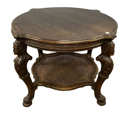 Neo Rococo Figural Carved Oak Center Table caned, two tier, 25"h., 33"dia Neo Rococo Figural Carved Oak Center Table caned, two tier, 25"h., 33"dia